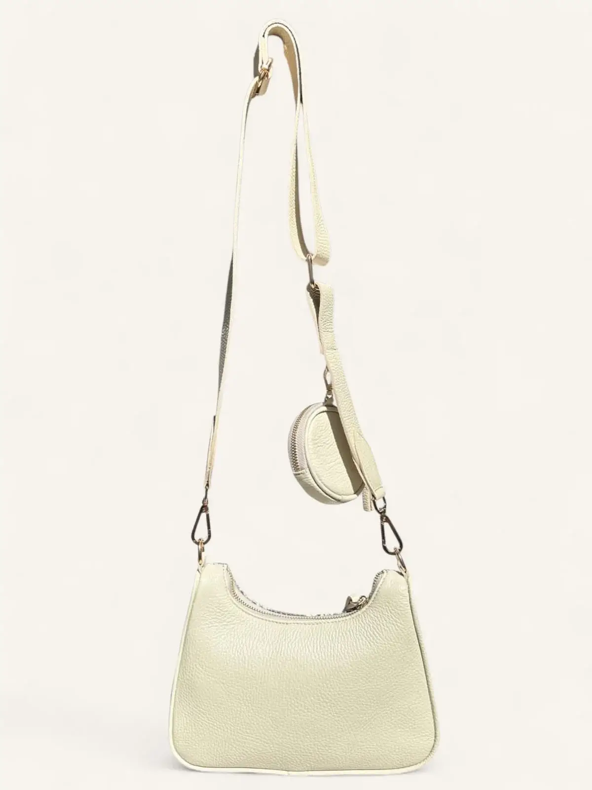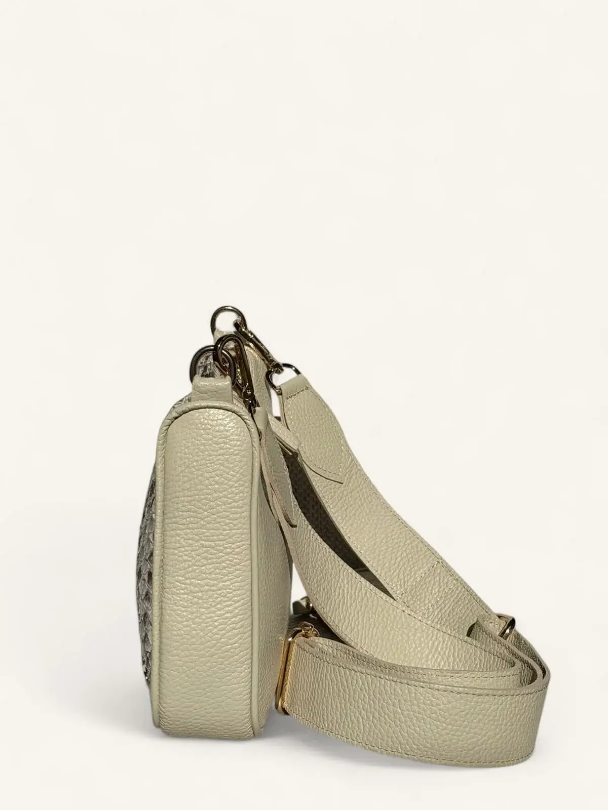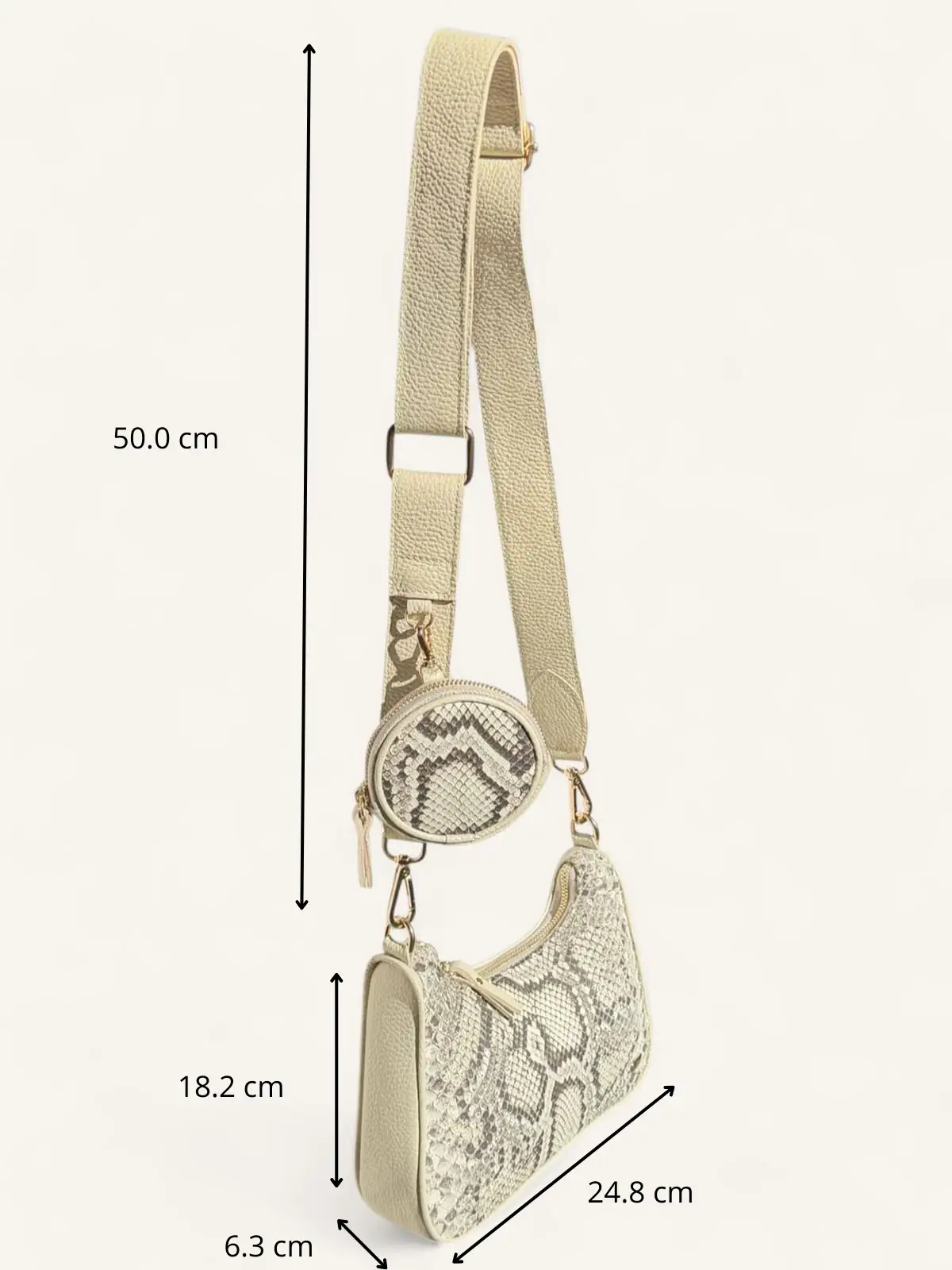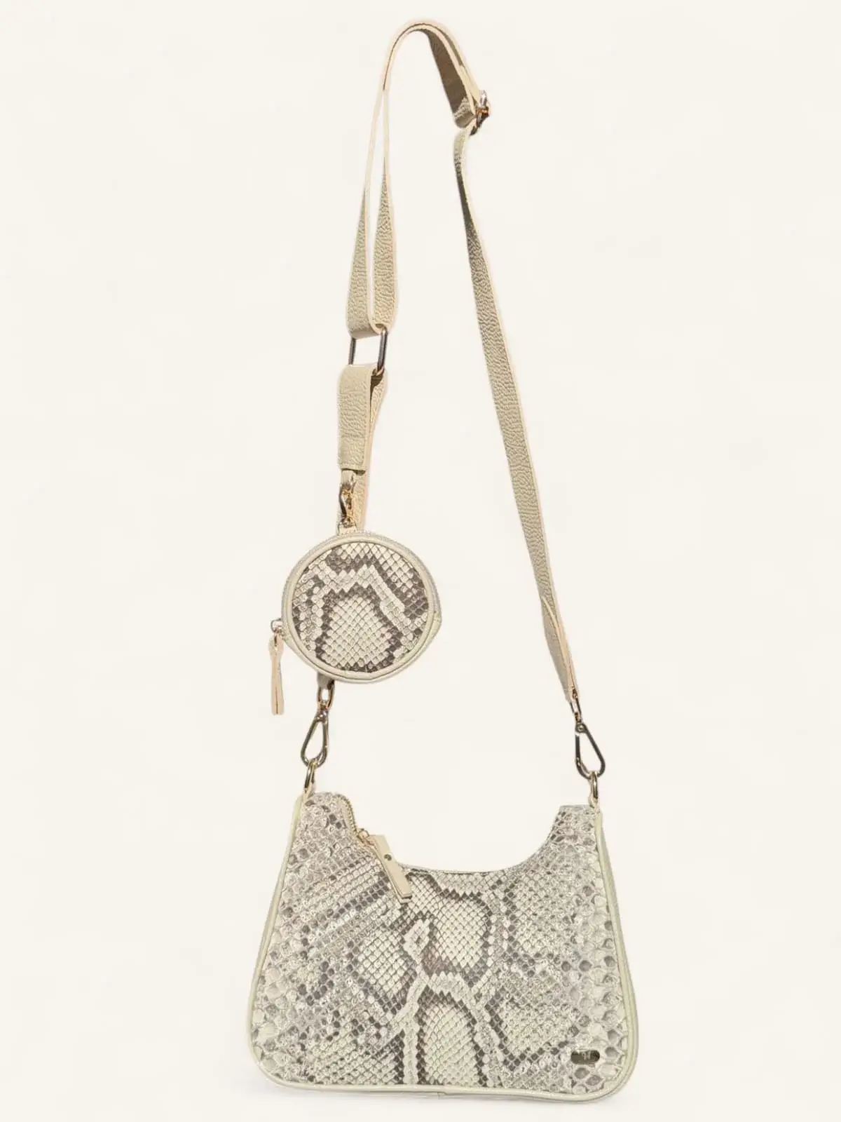 Bolsa bandolera de piel de pitón color hueso, elegante y ligera. Diseño compacto con espacio para lo esencial y monedero circular a juego. Ideal para looks sofisticados día y noche.