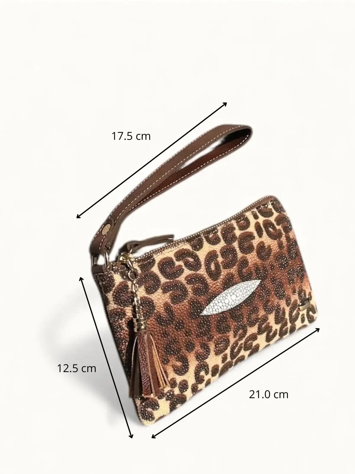 Si buscas una bolsa tipo muñequera en piel de mantarraya animal print café con beige que combine lujo exótico, contraste cálido y funcionalidad elegante, esta pieza será un complemento distintivo en tu colección.