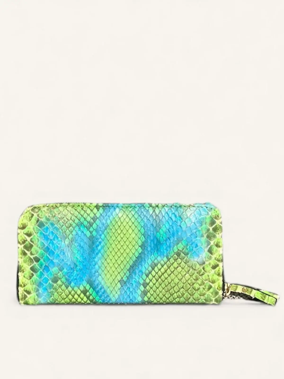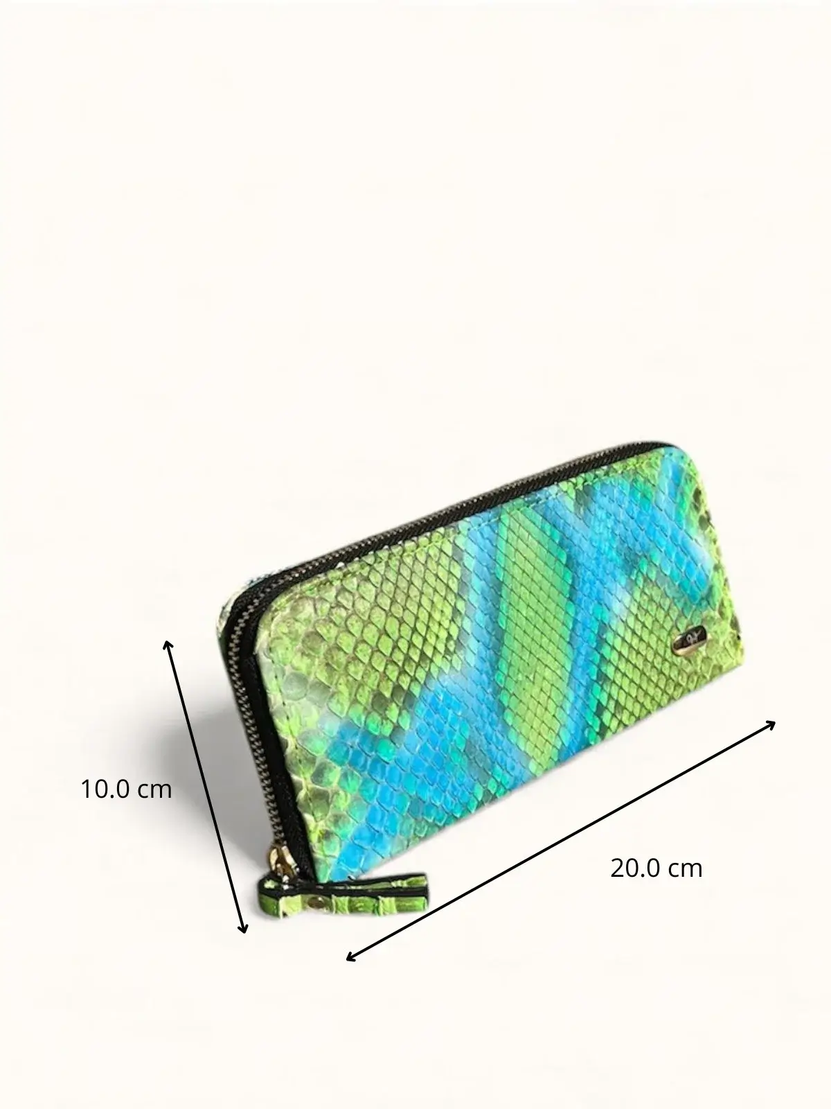 Cartera para dama en piel auténtica de pitón color azul y verde con cierre. Diseño elegante y funcional con textura exótica y organización segura para el día a día.