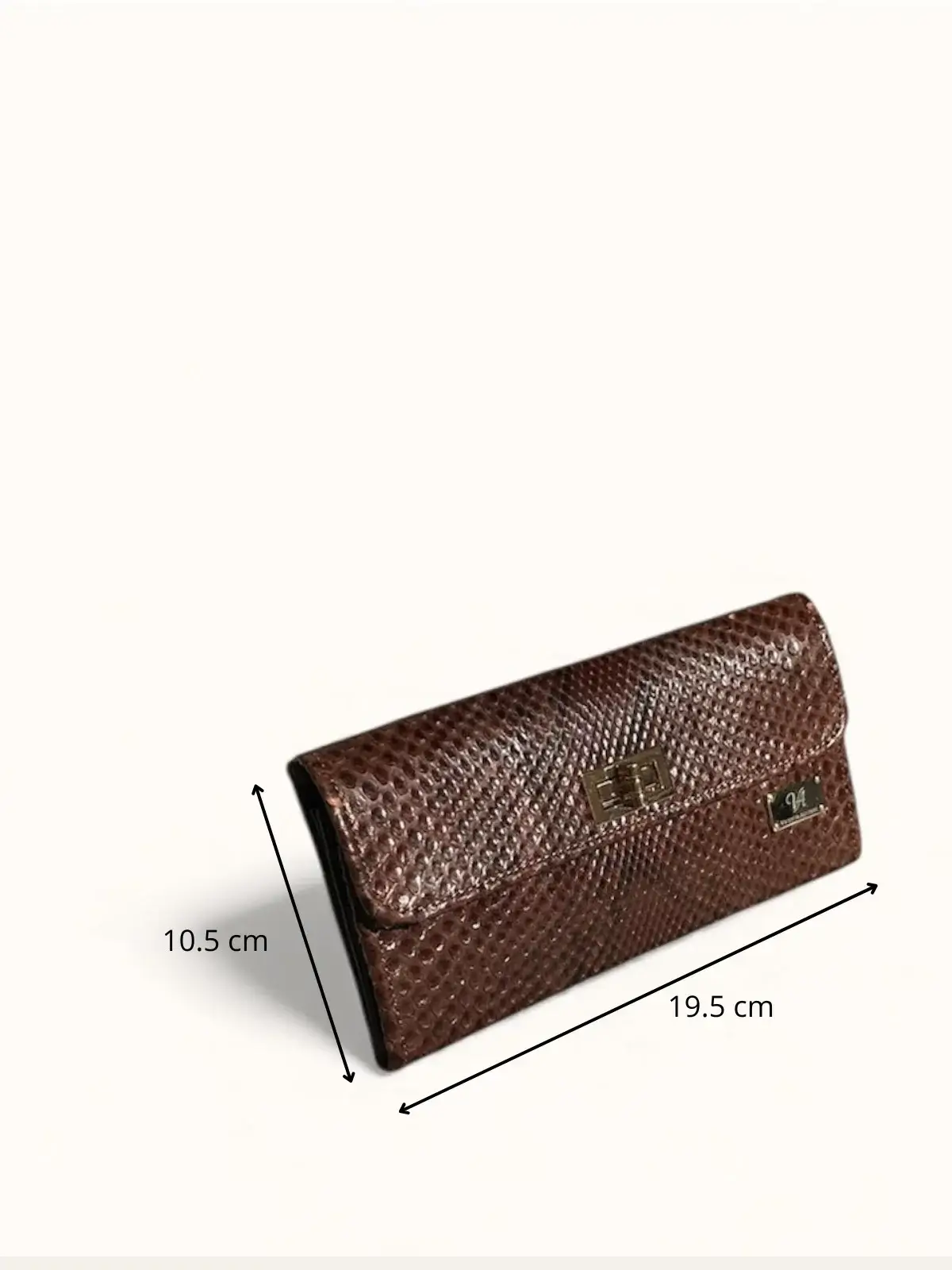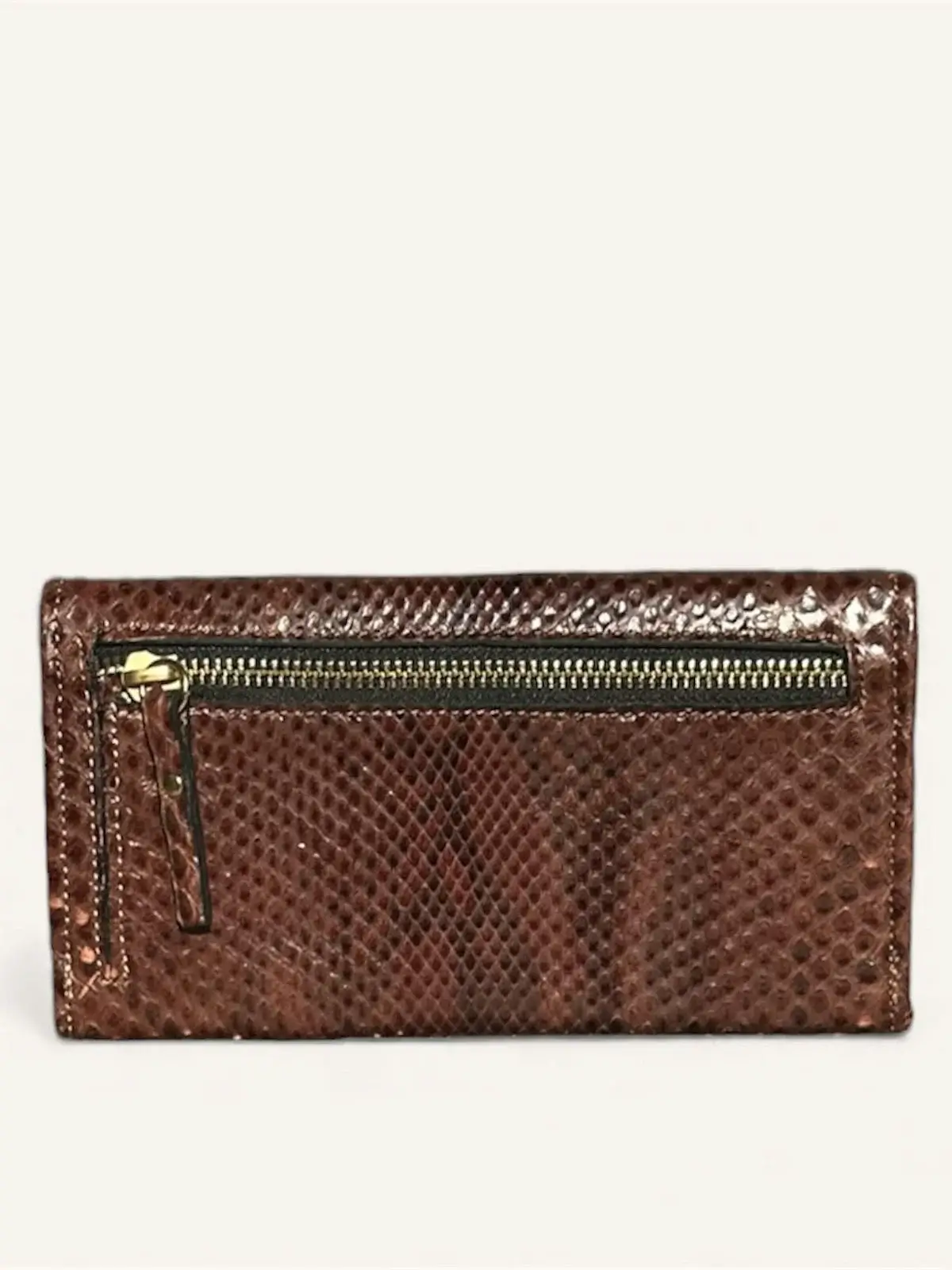 Cartera para dama en piel auténtica de pitón color chocolate con broche. Diseño compacto y elegante con textura exótica y organización práctica para el día a día.